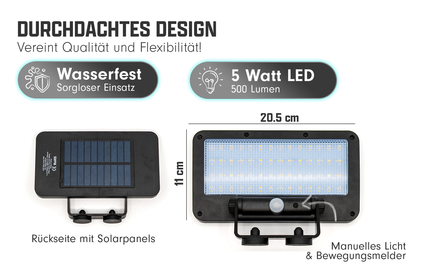 Die Solar-LEDs liefern helles, energiesparendes Licht und werden über ein integriertes Solarmodul geladen. Der bewegungsgesteuerte Sensor aktiviert das Licht automatisch, sobald jemand in den Erfassungsbereich tritt – praktisch, sicher und stromsparend. So hast du immer zuverlässige Beleuchtung, wenn du sie brauchst.