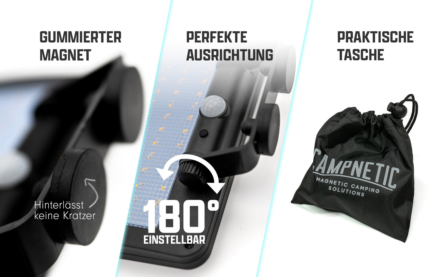 Mit der Camping LED Solar Lampe hast du eine flexible, sichere und energiesparende Beleuchtungslösung, die sich einfach montieren lässt. Du kannst sie überall dort anbringen, wo Metallflächen vorhanden sind – egal ob Van, Anhänger, Werkstatt oder Garten.