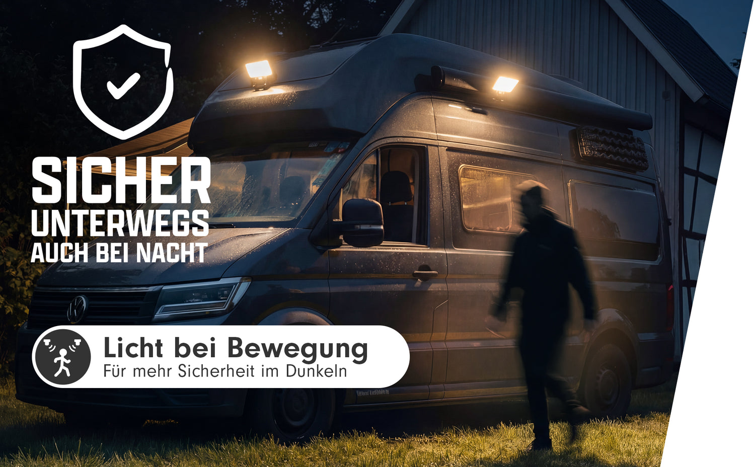 Bei Dauerbetrieb leuchtet die Lampe ca. 60 Minuten. Durch den Bewegungsmelder verlängert sich die Nutzungsdauer im Alltag auf mehrere Nächte, je nach Anzahl der Aktivierungen und Sonneneinstrahlung. Die Lampen sind nicht dafür ausgelegt, einen Stellplatz dauerhaft zu beleuchten, sondern bieten gezieltes Licht bei Bewegung – ideal als Orientierungshilfe, Sicherheit im Dunkeln oder für kurze Wege rund um den Camper.