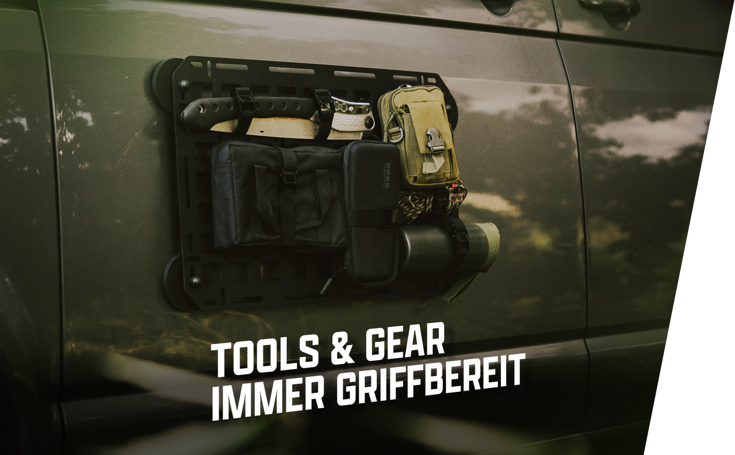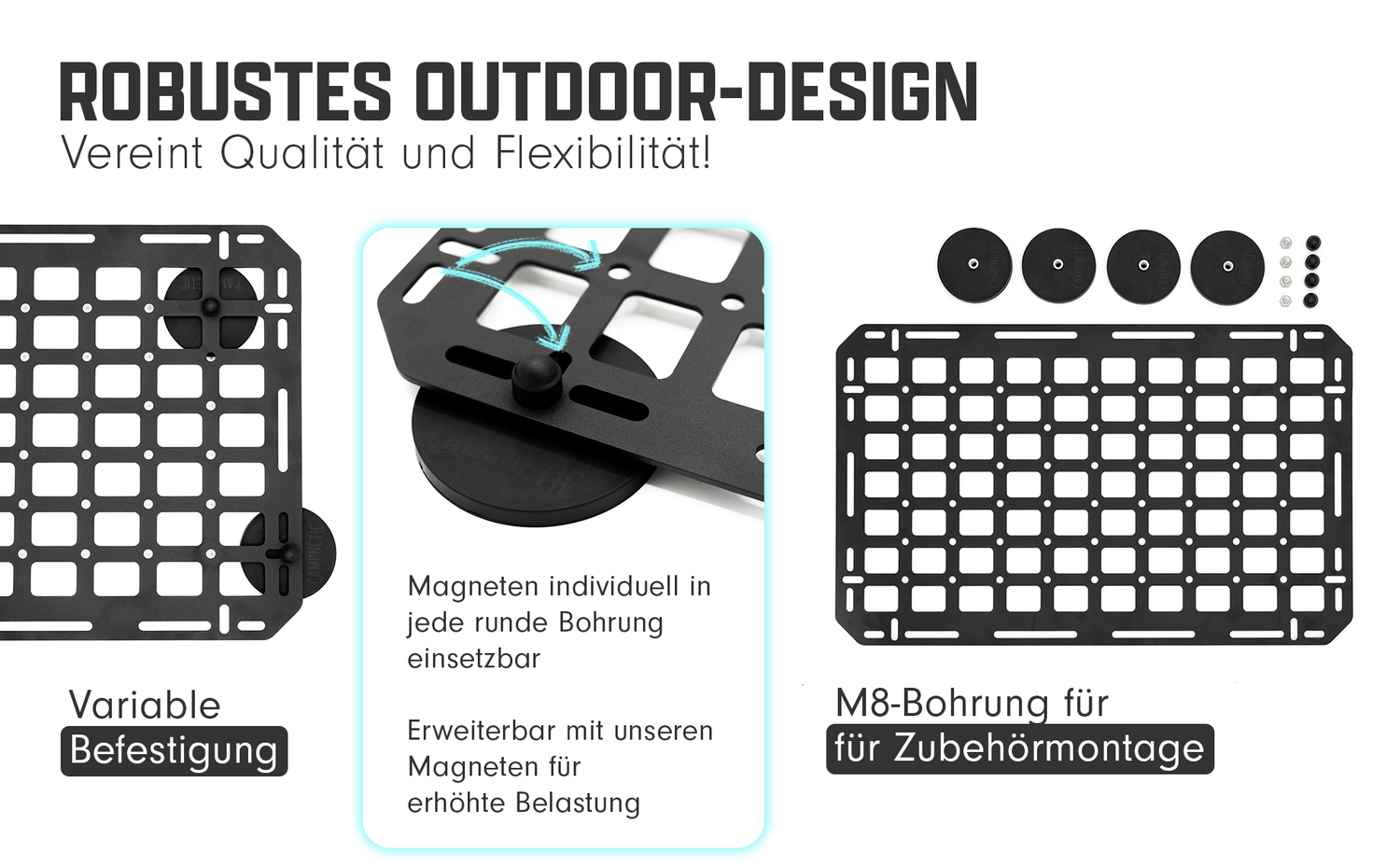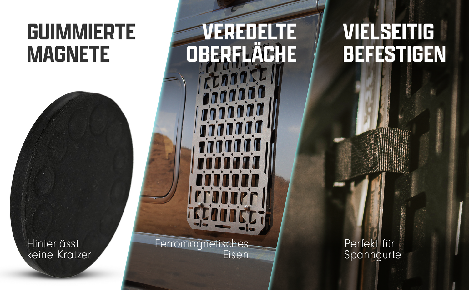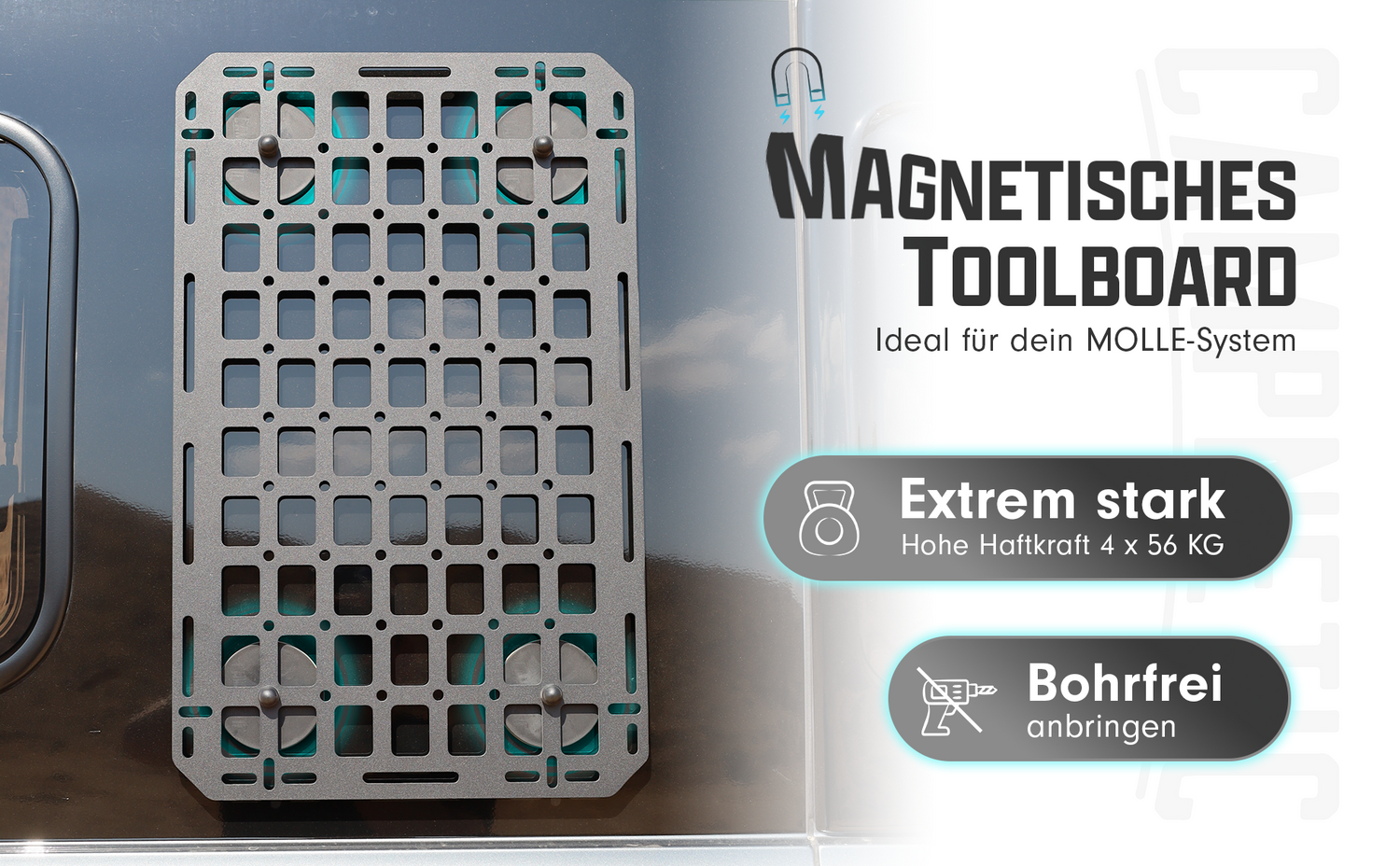 Das magnetische Toolboard – auch Molleboard, Utility Board oder Organzier Board genannt – ist die flexible Ordnungslösung für Vanlife, Offroad und Camper. Mit vier gummierten Neodym-Magneten (Ø 88 mm, je 56 kg Haftkraft) lässt es sich variabel – ganz ohne Bohren – am Fahrzeug befestigen. Die Magnete können in jede runde Bohrung des Boards eingesetzt und so optimal positioniert werden. Bei höherer Belastung lässt sich das Board mit zusätzlichen Magneten von uns erweitern. Die Oberfläche ist magnetisch, so halten auch Magnethalterungen direkt darauf. Zubehör lässt sich bequem über M8-Schrauben anbringen oder per Spanngurt fixieren. Die gummierte Magnetbasis schont den Lack, die Montage geht sekundenschnell, das Abnehmen ebenso.