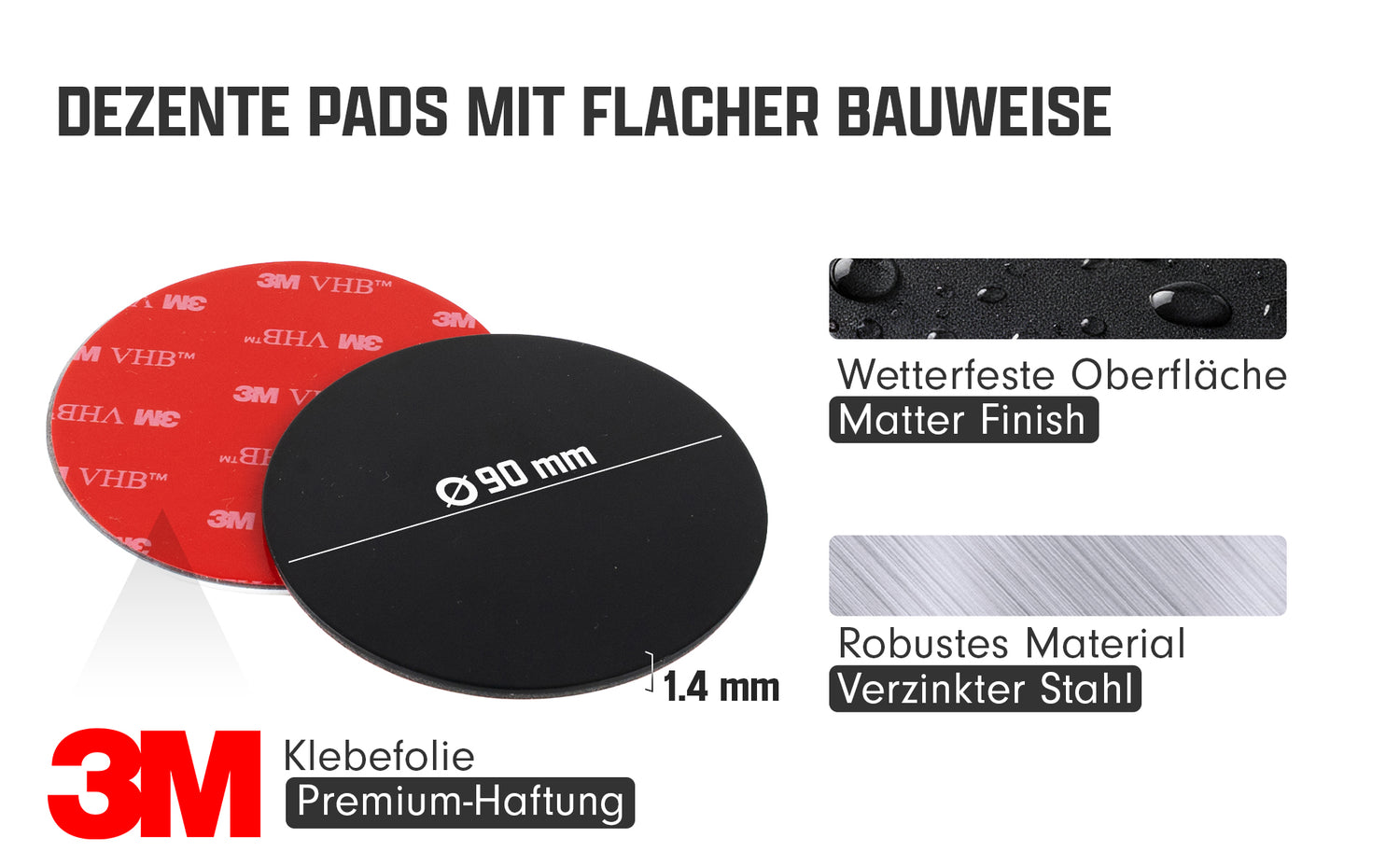 Die Pads sind aus hochwertigem, verzinktem Stahl gefertigt, nur 1,4 mm dünn und schmiegen sich dezent in dein Fahrzeugambiente ein – perfekt für die Anwendung im Innenraum oder auf lackierten Außenflächen.