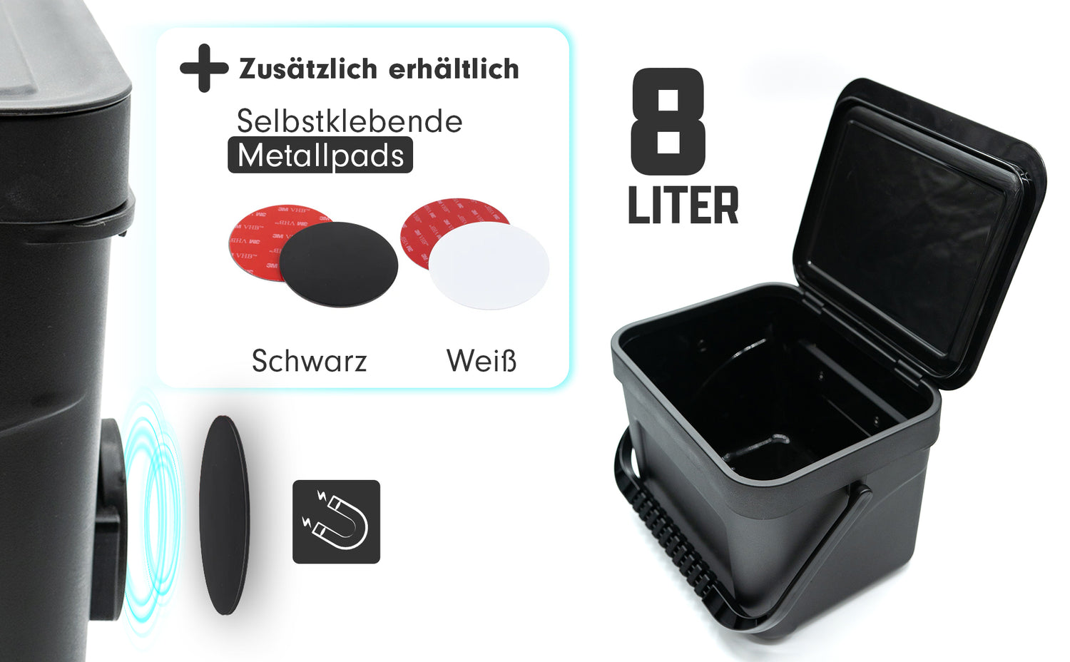 Für den Innenbereich sind zwei selbstklebende Metallpads in Schwarz oder Weiß zusätzlich erhältlich – damit du den Mülleimer z. B. an der Küchenzeile oder im Bad befestigen kannst. So hast du ihn immer dort, wo du ihn brauchst – und nimmst ihn bei Bedarf einfach mit nach draußen.