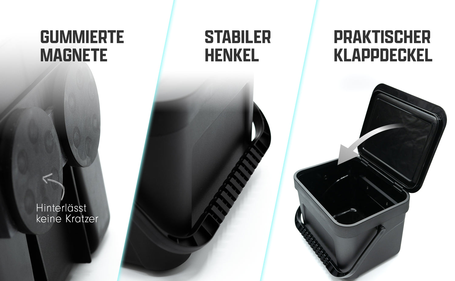 Dank zwei extra starker, gummierter Magneten (66 mm, je 25 kg Haftkraft) haftet der Camping Mülleimer sicher an allen metallischen Außenflächen – ohne zu verrutschen, ohne Kratzer. Einfach andocken und fertig.