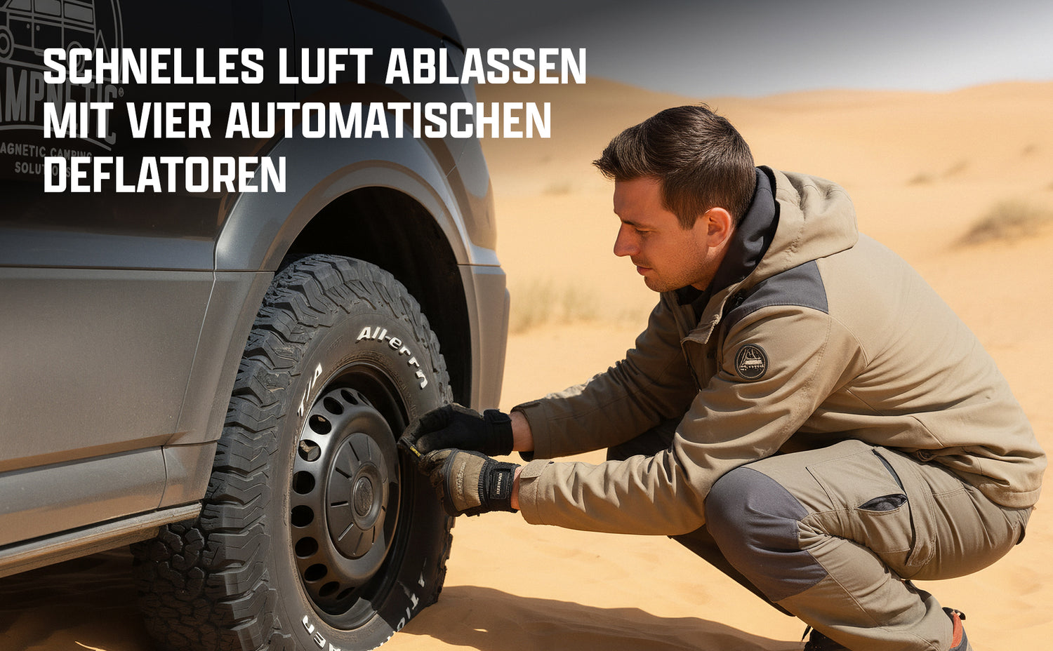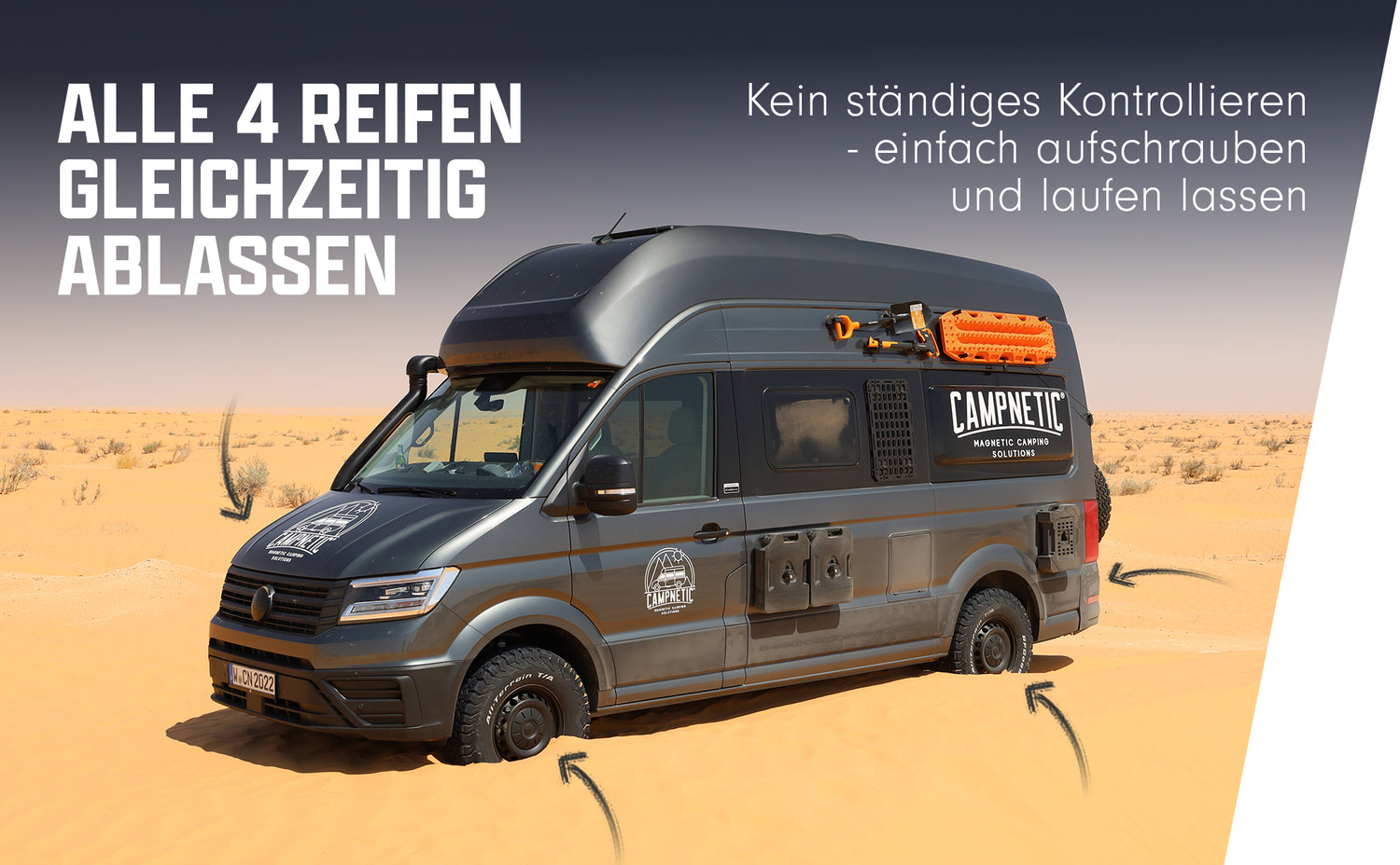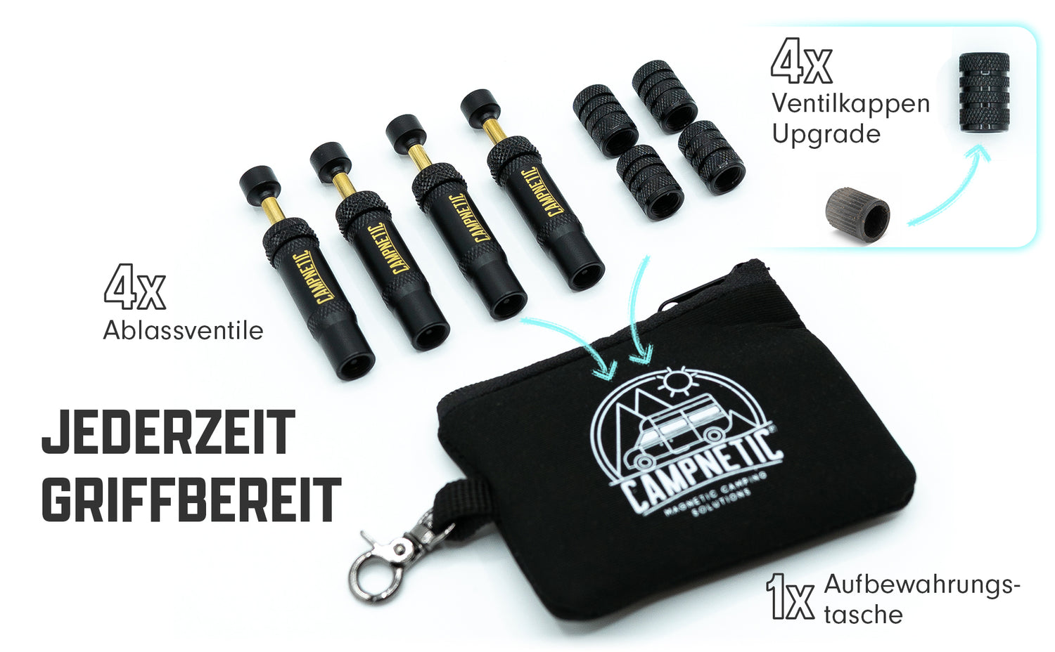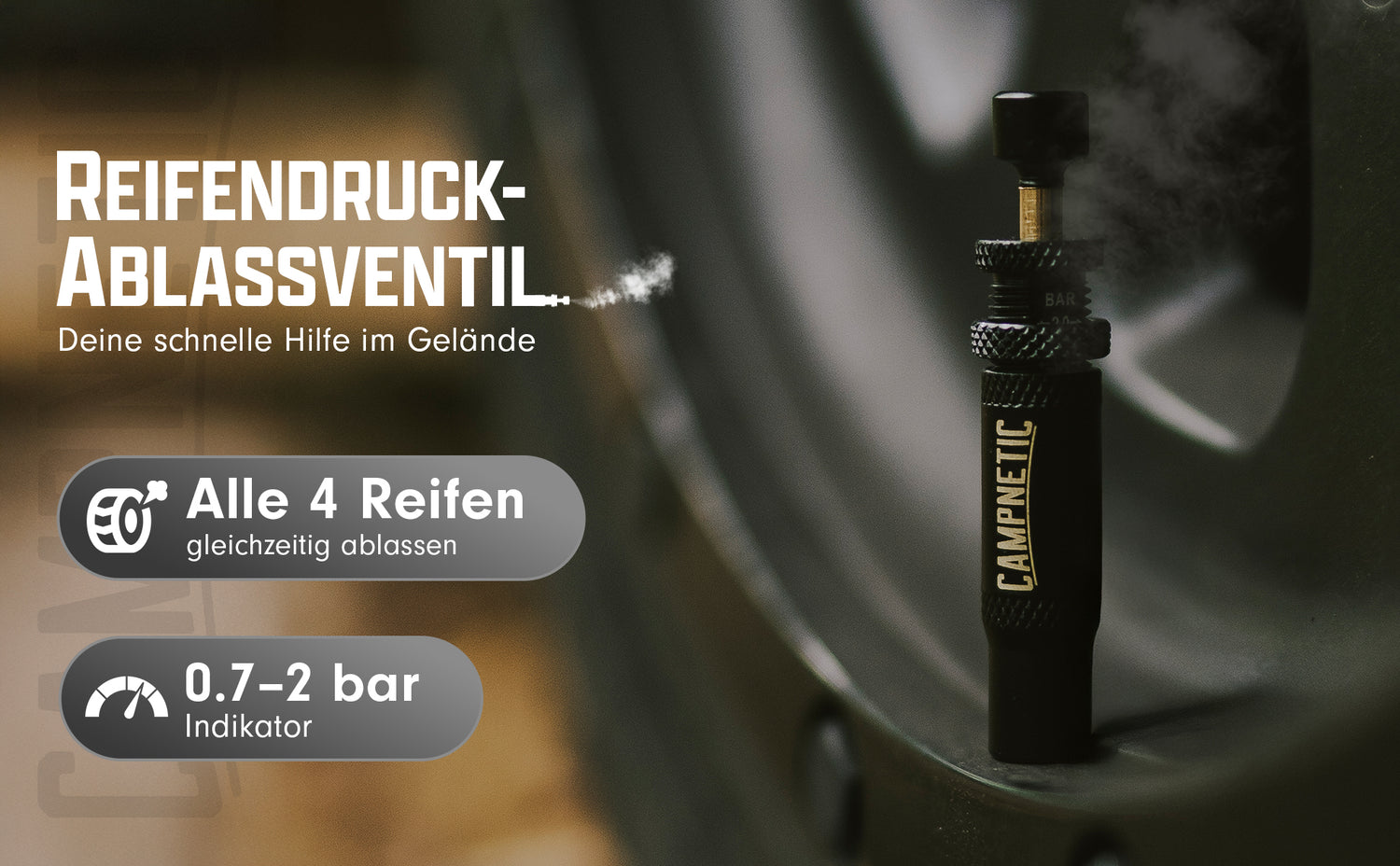 Wer Offroad unterwegs ist, kennt es: Auf Sand, Schotter oder im Gelände braucht es weniger Luft im Reifen – und das möglichst schnell. Mit den Campnetic Reifendruckablassventilen kannst du vier Reifen gleichzeitig entlüften, ohne ständig mit dem Manometer von Rad zu Rad zu laufen.