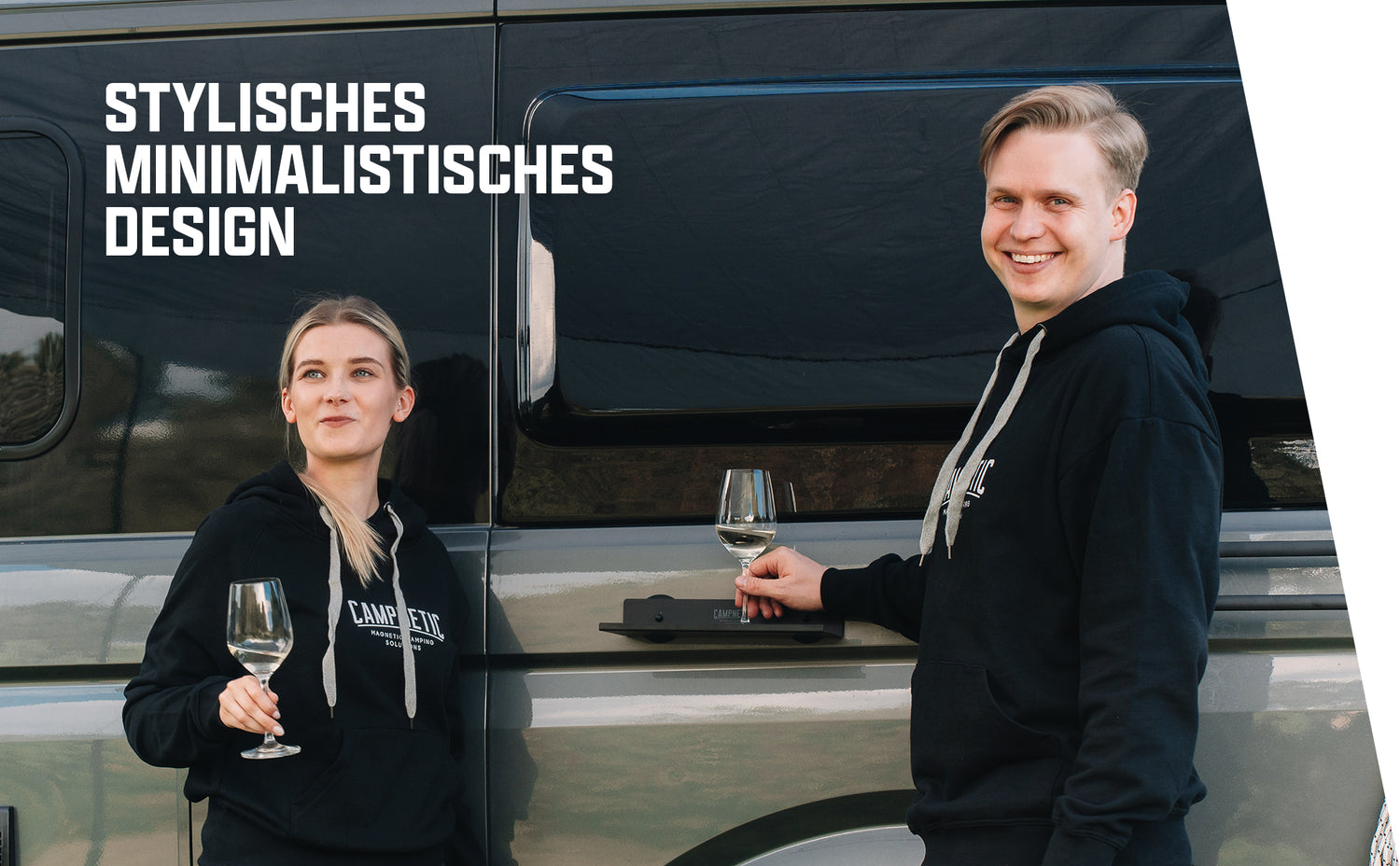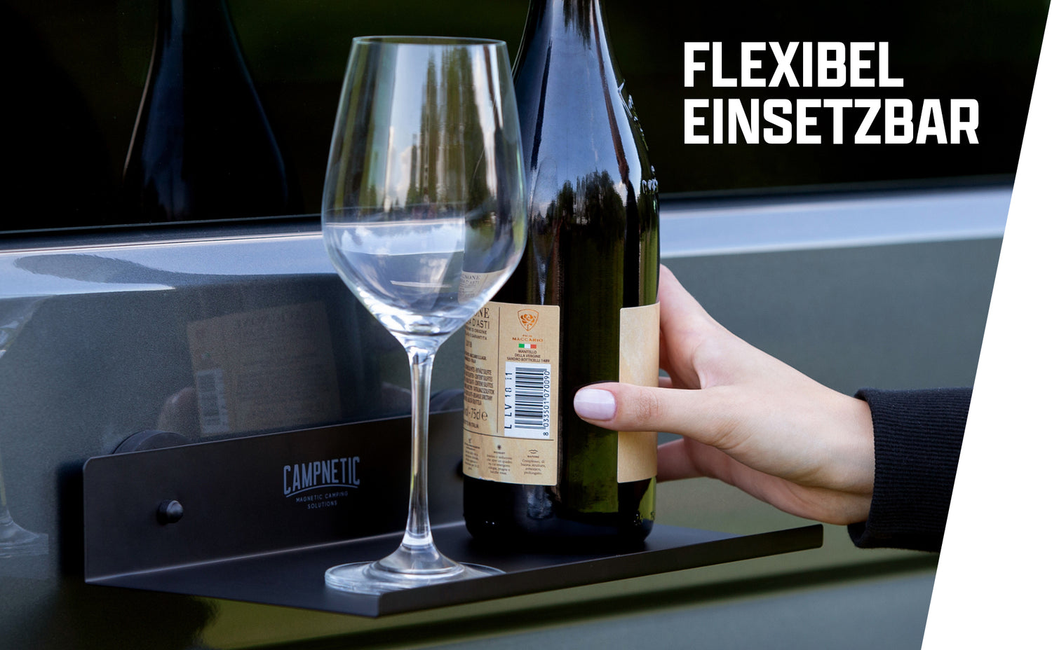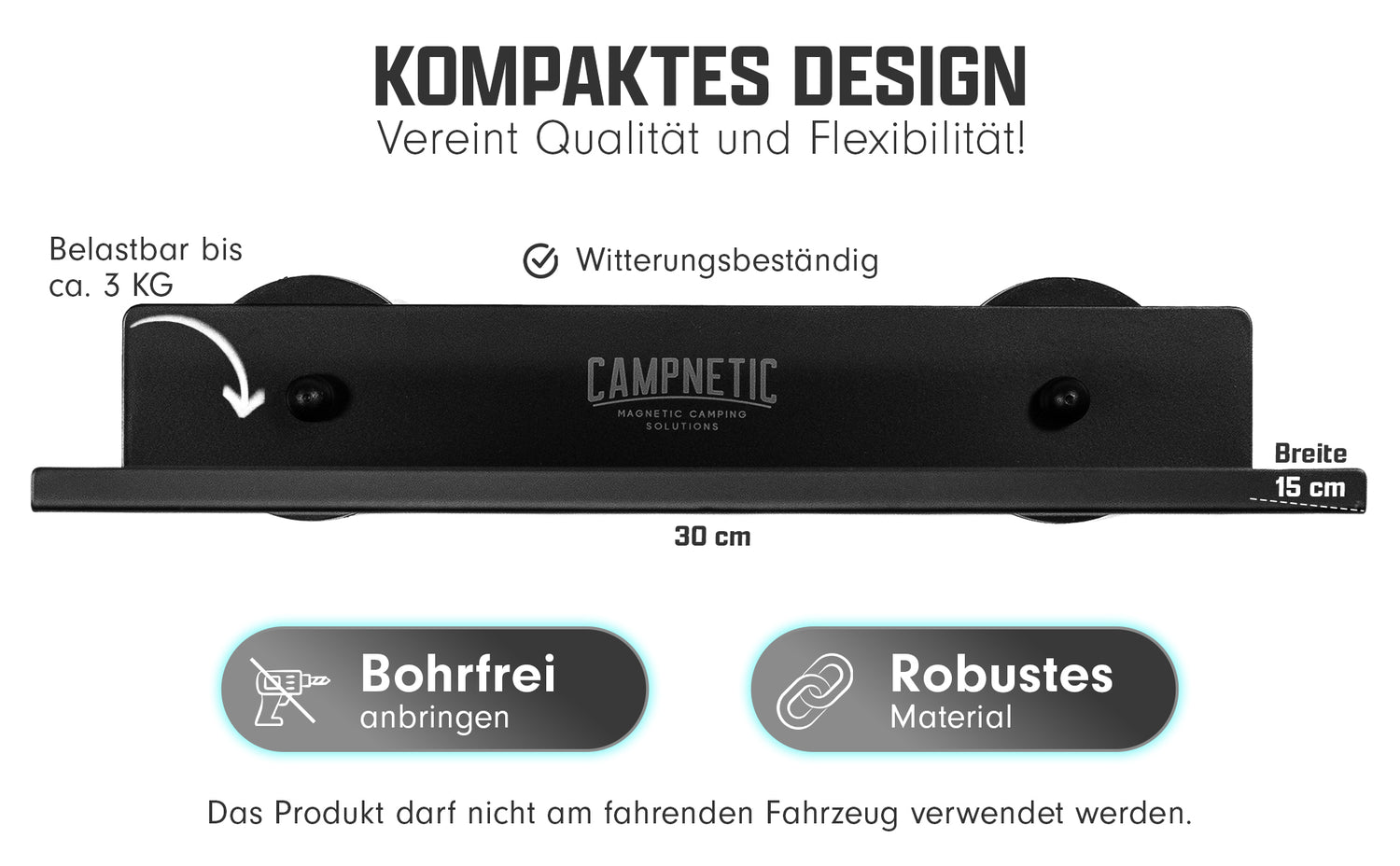 Il vassoio magnetico è realizzato in materiale robusto e resistente alle intemperie, perfetto per qualsiasi avventura. Misura 30 x 15 cm e può essere utilizzato in diversi modi. Che si tratti di stereo, bicchieri, bagnoschiuma per docce esterne o altro, il ripiano Campnetic offre un'area di appoggio sicura e pratica. Goditi più spazio nel tuo VW Crafter, Fiat Ducato, Mercedes Sprinter o Ford Transit.