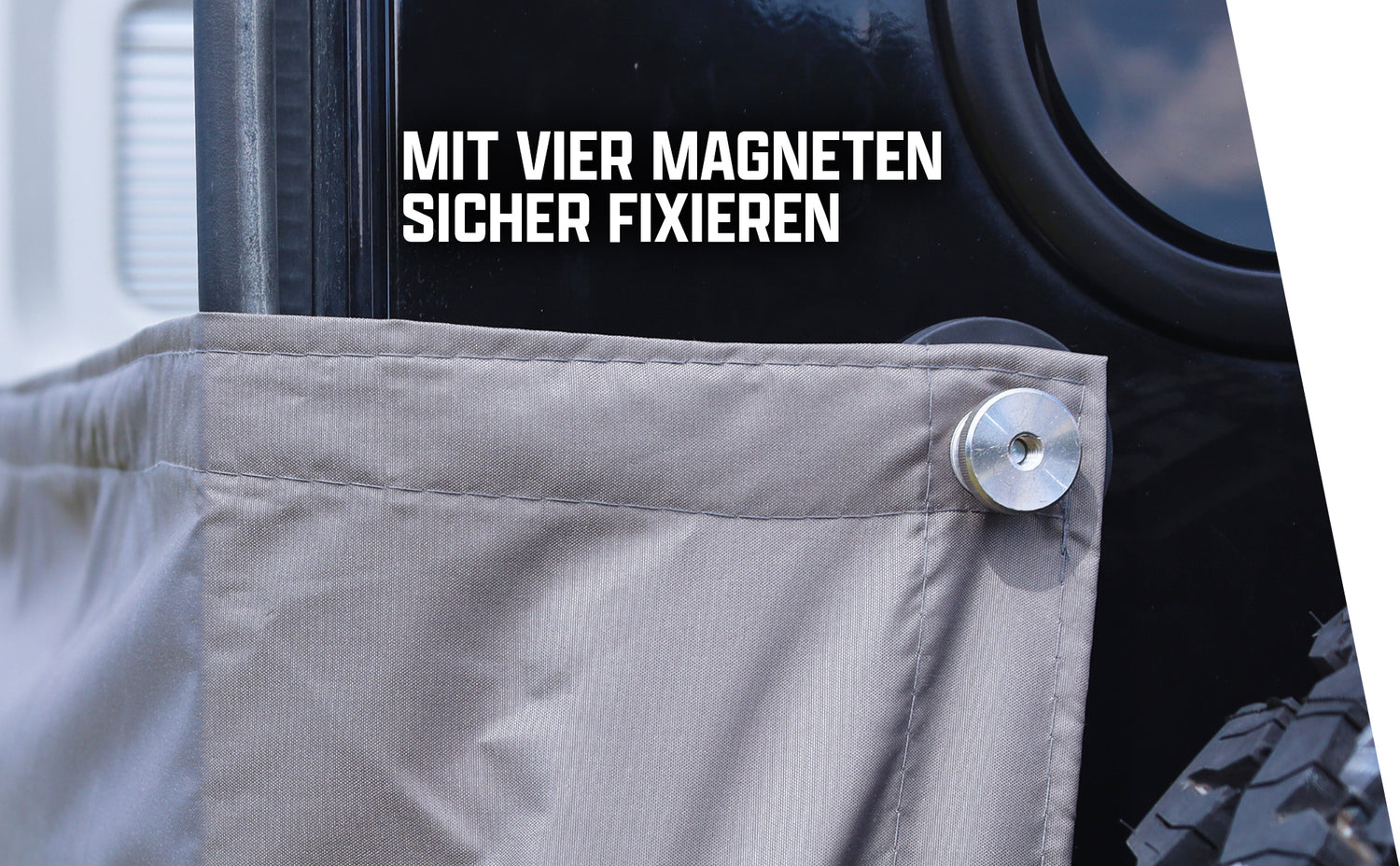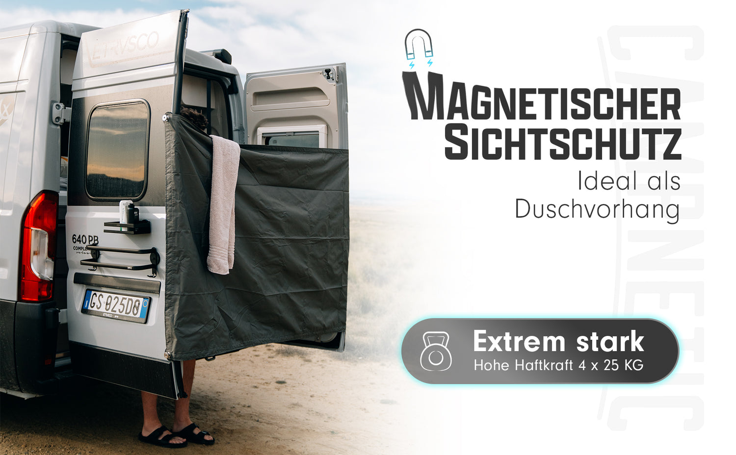 La schermatura per la privacy Campnetic, appositamente sviluppata, è il compagno perfetto per la vita in camper e van. Particolarmente adatta ai furgoni, questa schermatura per la privacy è ideale per furgoni come VW Crafter, Mercedes Sprinter, Fiat Ducato, Peugeot Boxer e modelli simili. Grazie ai magneti gommati super potenti, può essere fissata facilmente e saldamente a tutte le superfici magnetiche, senza forare o incollare. Che la usiate come schermatura per la privacy o come tenda da doccia, vi proteggerà in modo affidabile da sguardi indiscreti.