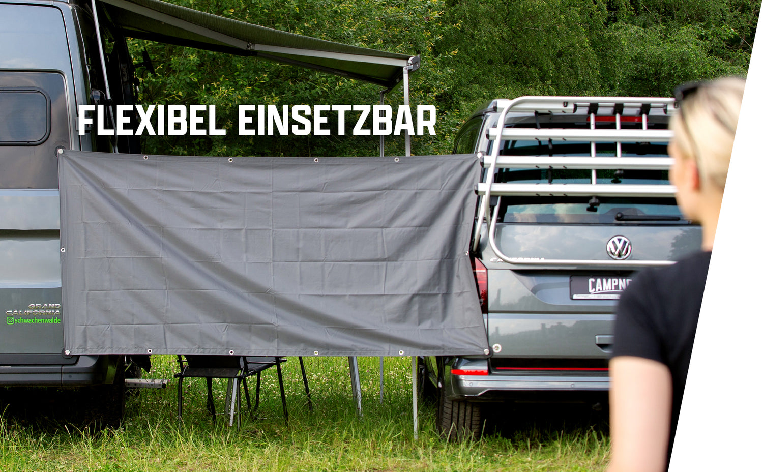 La sua maneggevolezza e il fissaggio flessibile consentono di installarlo esattamente dove serve la privacy. E se cambiate posizione? Nessun problema! La zanzariera può essere rimossa in pochi secondi e riposizionata in una nuova posizione sul vostro camper. Che sia tesa tra due camper o come zanzariera tra le porte posteriori, la zanzariera Campnetic si adatta sempre esattamente alle vostre esigenze.