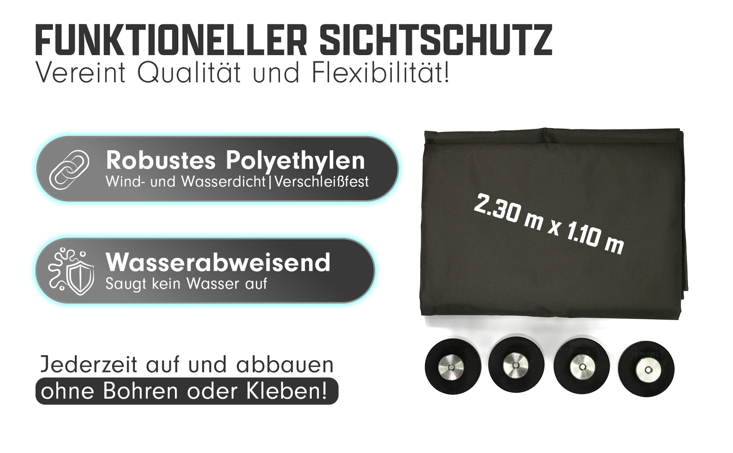 La tenda frangivista Campnetic non è solo opaca, ma anche idrorepellente e ad asciugatura rapida, il che la rende perfetta per l'uso quotidiano. Grazie alla sua superficie antisporco, rimane pulita anche in caso di uso intensivo. I quattro occhielli in alluminio di alta qualità garantiscono un fissaggio sicuro e antiruggine della tenda frangivista, mantenendola in perfette condizioni a lungo.