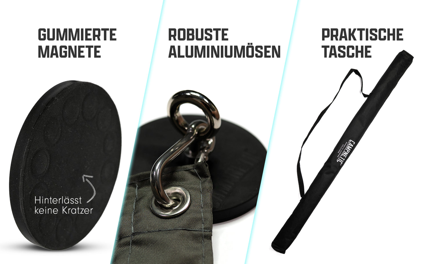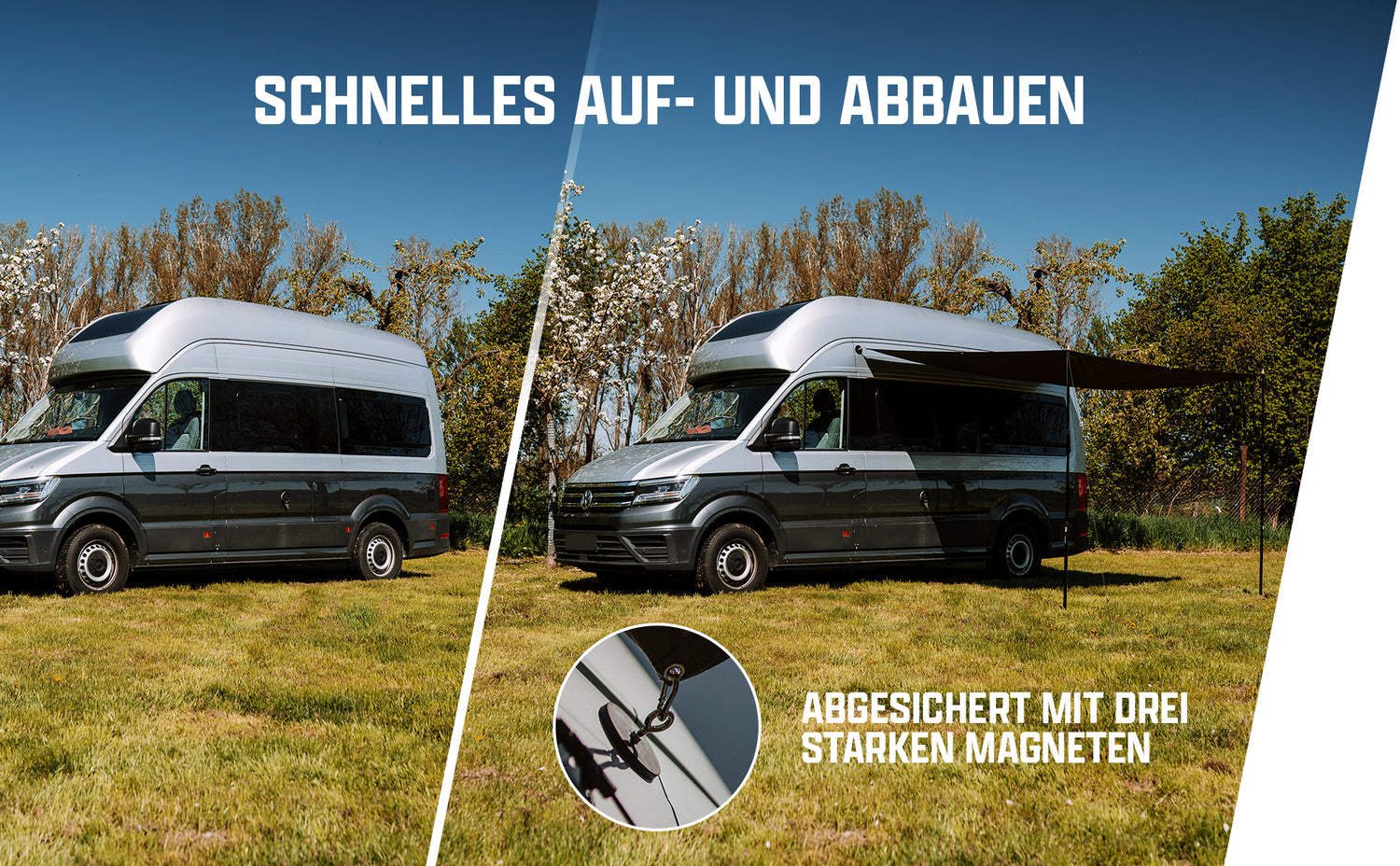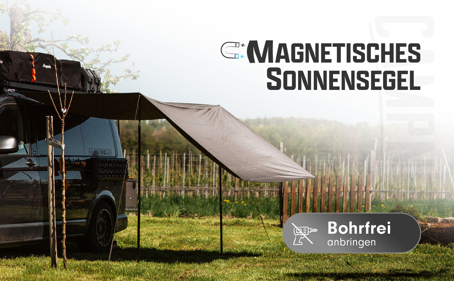 Questa versatile tenda da campeggio con attacco magnetico è il tuo nuovo must-have per il campeggio, la vita in camper, i festival e le avventure all'aria aperta che non dispongono di una tenda da sole sul proprio camper. Con dimensioni di 2,5 x 3 m, offre un'ampia protezione dal sole e dalla pioggia, sia come telo, tenda da sole, protezione dalle intemperie o ombra. Grazie ai magneti super potenti da 56 kg con occhielli e ai robusti moschettoni in acciaio inox da 60 mm, il telo può essere fissato al tuo camper, auto o autobus in modo rapido e sicuro, senza bisogno di forare.