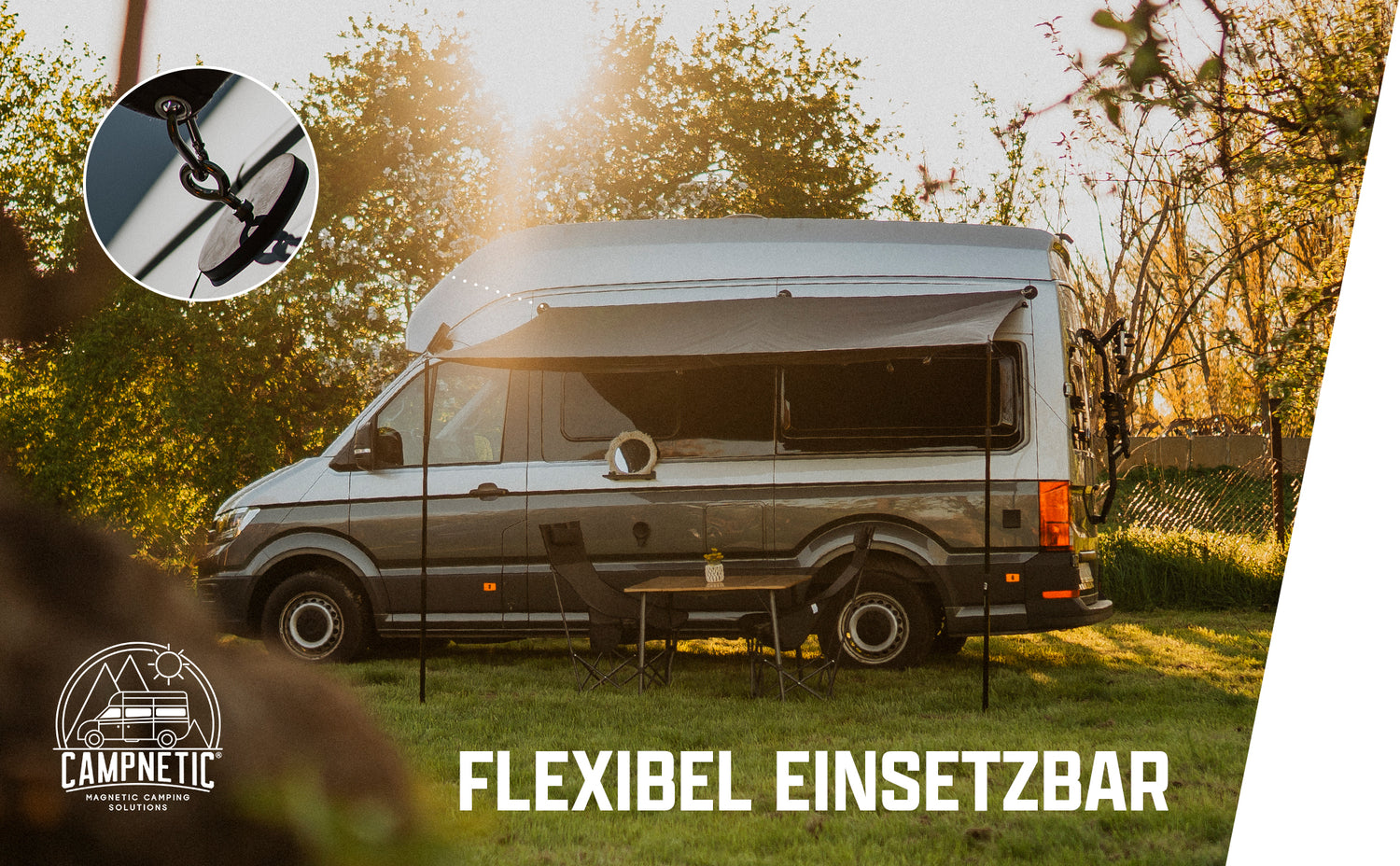 Adatto a tutti i furgoni, siano essi Mercedes Sprinter, VW Crafter, Grand California, VW Bus, Fiat Ducato, Ford Transit o tutti gli altri furgoni dotati di superfici magnetiche.
