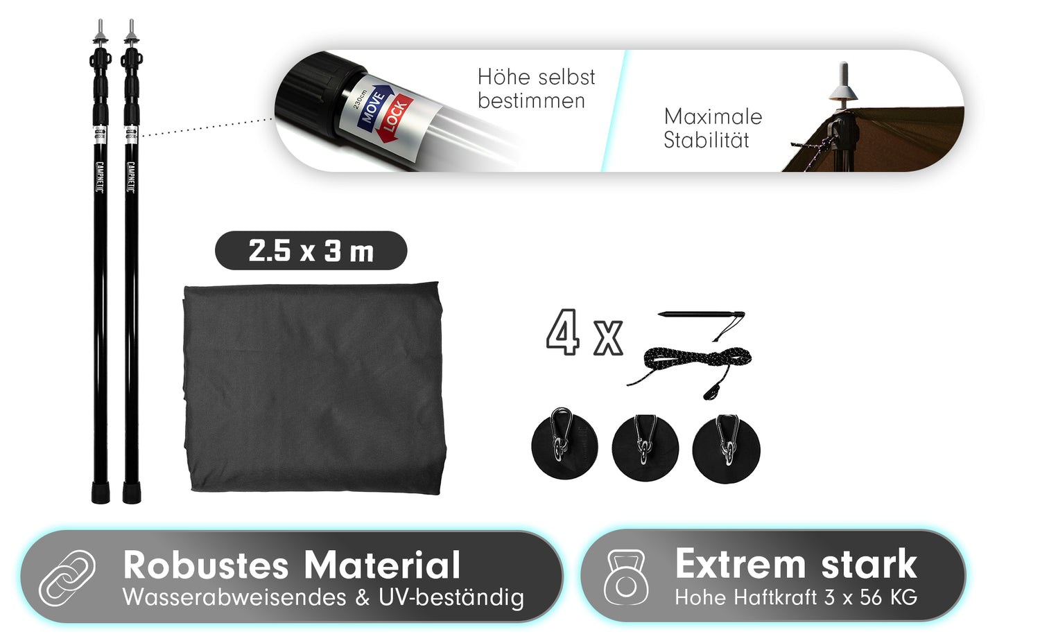 I pali telescopici inclusi si estendono fino a 2,3 m e consentono diverse opzioni di installazione, ad esempio come tettoia inclinata, parapioggia o schermo per la privacy. Sono inclusi quattro picchetti neri e quattro robuste corde per un ancoraggio sicuro. Il tutto è confezionato in modo compatto in una borsa separata per i pali e in una borsa portaoggetti Campnetic.
