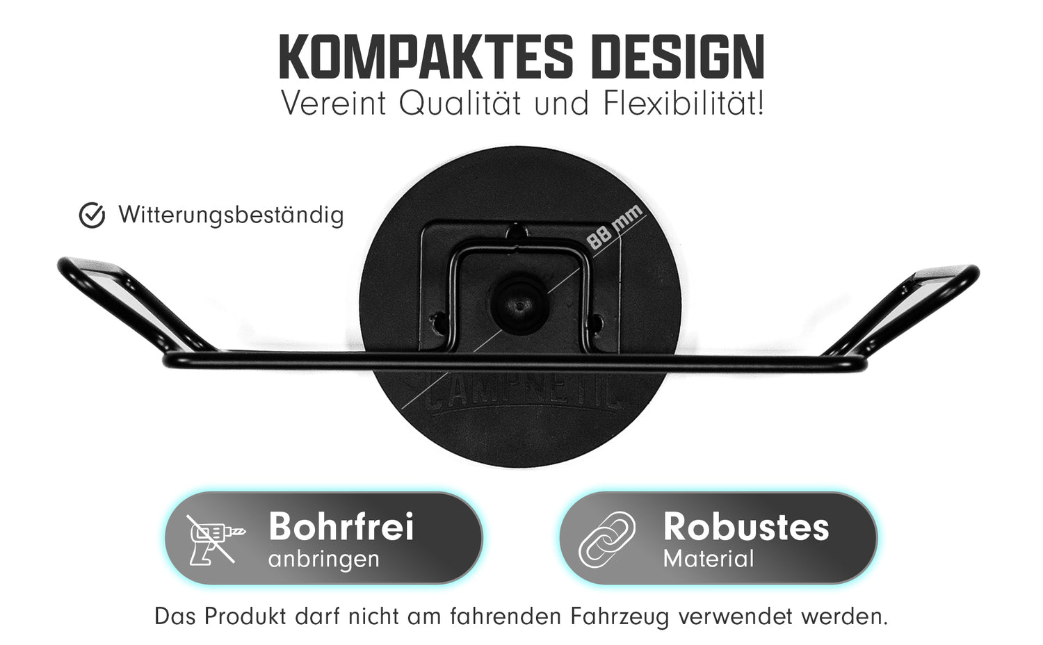 Dank seiner flexiblen Bauweise ist der Halter einfach zu verstauen, wenn er nicht benötigt wird. Du kannst ihn überall am Van anbringen und wieder abnehmen, je nach Bedarf und ohne großen Aufwand.