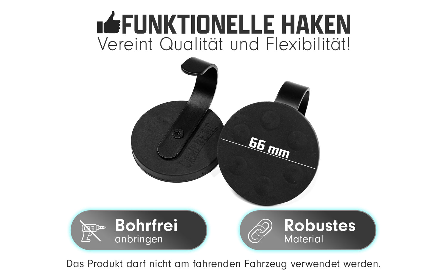 Der Campnetic Haken ist aus robustem und wetterfestem Material gefertigt, das jeder Abenteuerfahrt standhält. Er ist geeignet für verschiedene Gegenstände wie Kleidung, Handtücher, Taschen, Lampen, Werkzeug und vieles mehr. Er hat eine Haftkraft von bis zu 25kg und eine Verschiebekraft von bis zu 7.5kg und ist leicht zu reinigen.