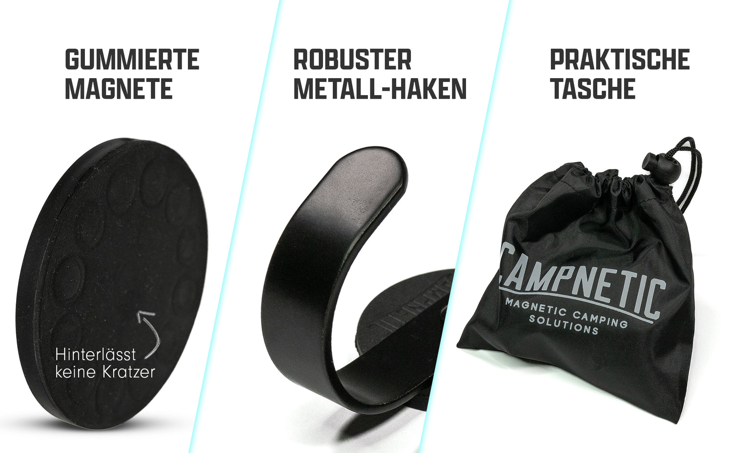 Der Campnetic Haken ist aus robustem und wetterfestem Material gefertigt, das jeder Abenteuerfahrt standhält. Er ist geeignet für verschiedene Gegenstände wie Kleidung, Handtücher, Taschen, Lampen, Werkzeug und vieles mehr. Er hat eine Haftkraft von bis zu 10kg und eine Verschiebekraft von bis zu 3kg und ist leicht zu reinigen.