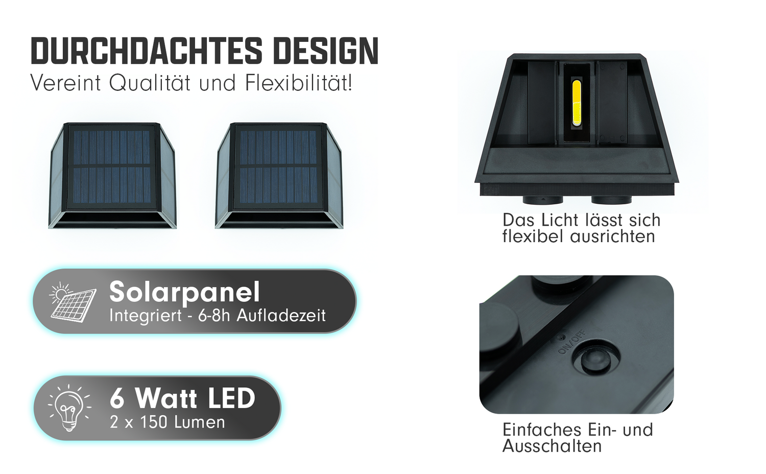 Dank des integrierten Solarpanels ist kein Stromanschluss nötig. Der Akku lädt sich tagsüber automatisch auf und versorgt das Licht über viele Stunden hinweg