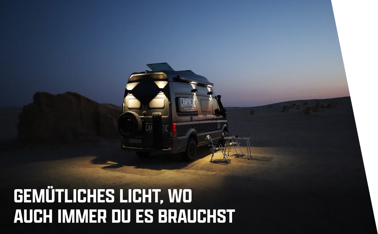 Ob beim Camping im Van auf der Terrasse oder als Outdoor Lichtquelle – dieses Solar Ambientelicht bringt Stimmung Funktionalität und Flexibilität überall dorthin wo du sie brauchst