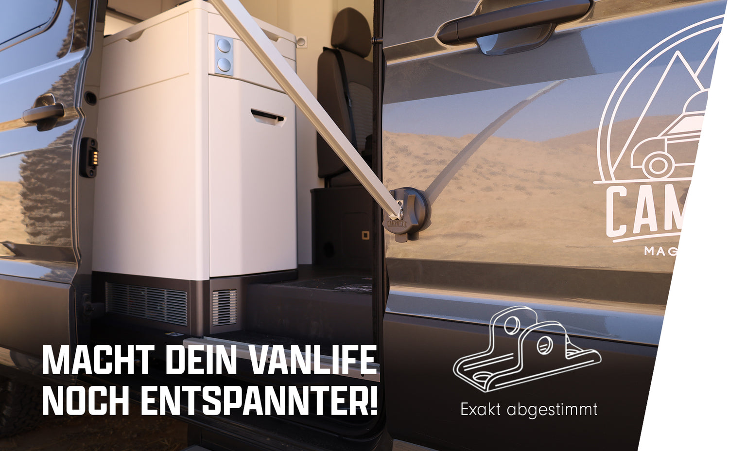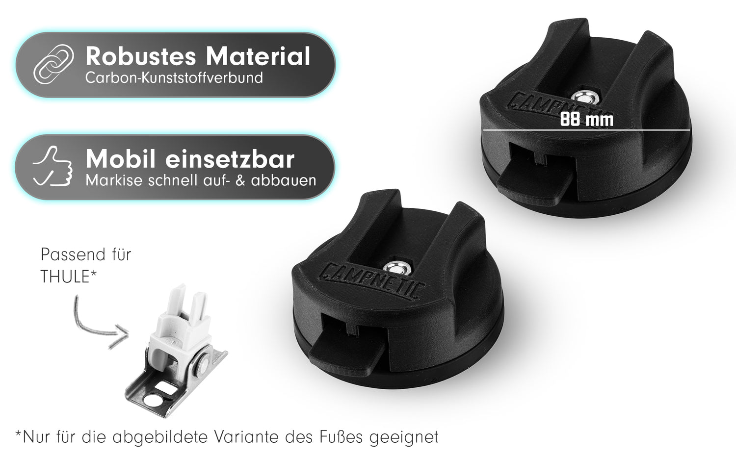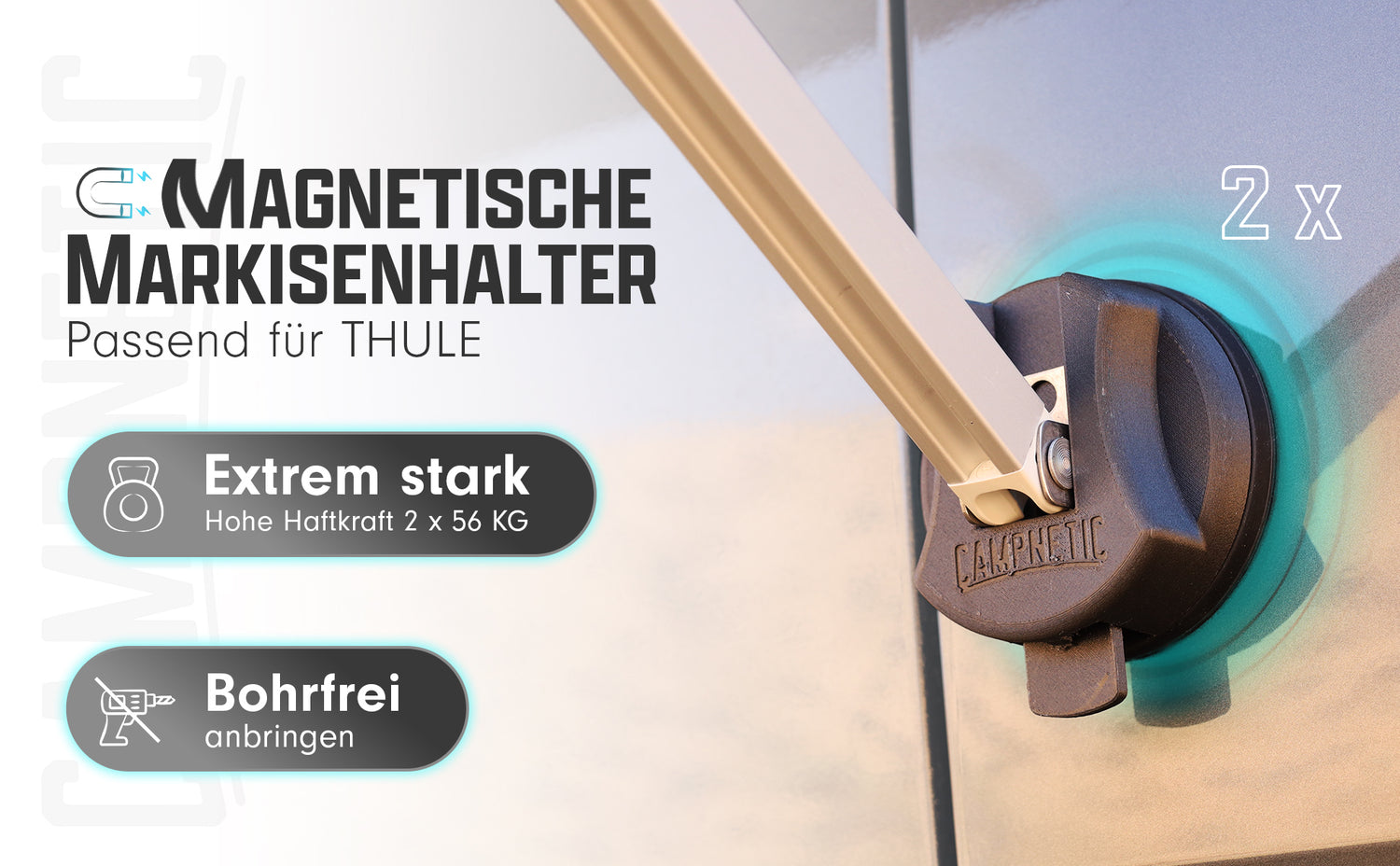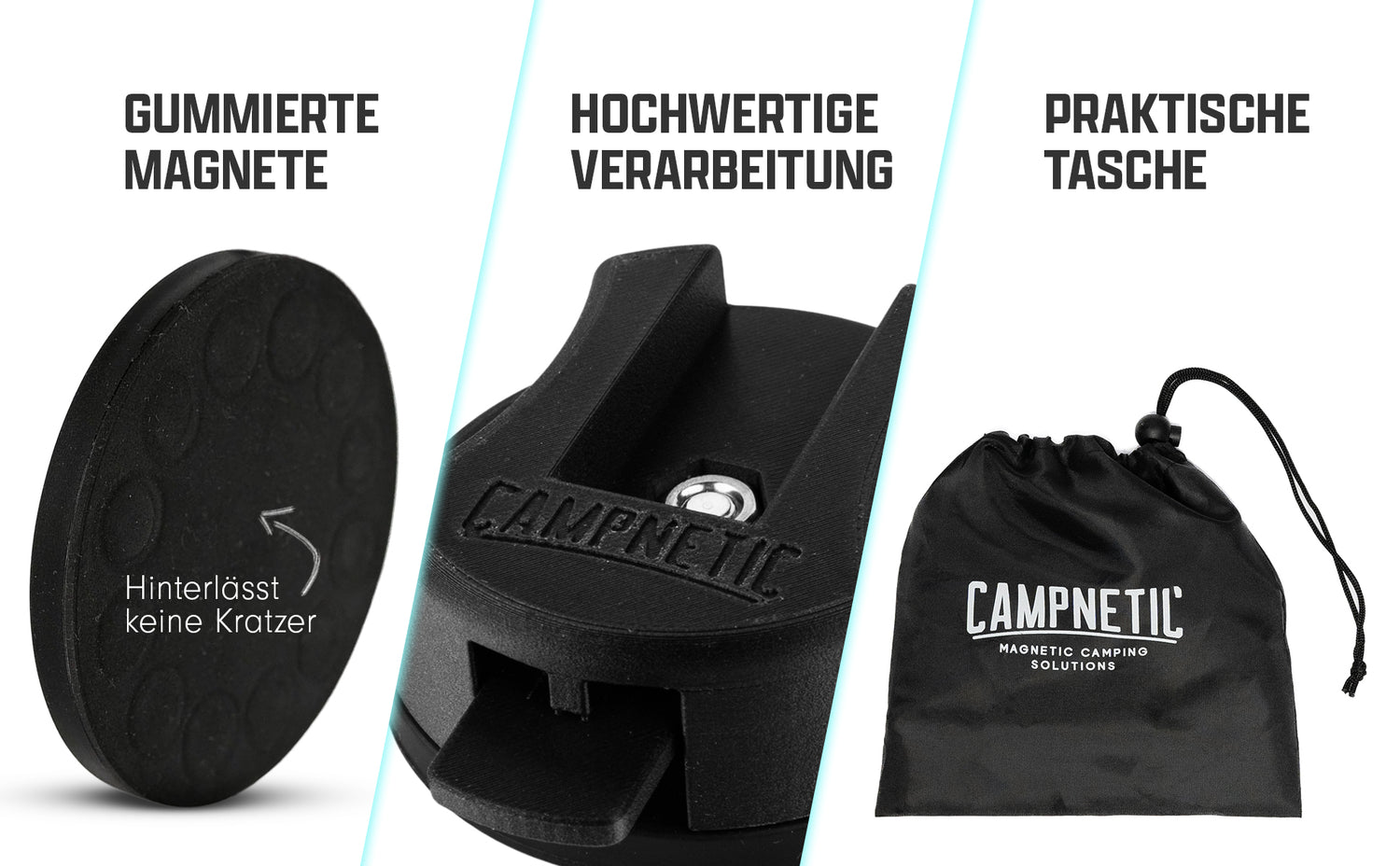 Mit dem magnetischen Markisenhalter von Campnetic bleibt deine Thule-Markise, Dometic-Markise oder Fiamma-Markise zuverlässig und elegant am Fahrzeug verankert – selbst auf Asphalt, Kies oder harten Untergründen, wo herkömmliche Heringe versagen. Dank einer enormen Haftkraft von 56 kg pro Magnet und der großzügigen, gummierten Magnetfläche von 88 mm, fixierst du deine Markisenstützfüße stabil, kratzfrei und sekundenschnell direkt an der Fahrzeugkarosserie.
