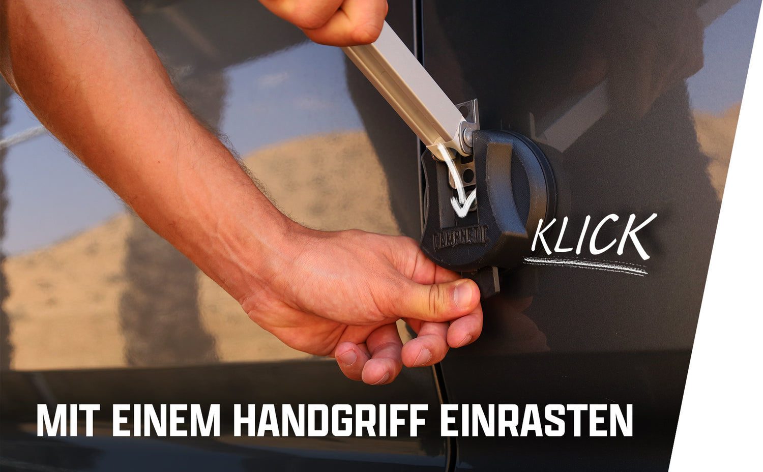 Der clevere Arretiermechanismus rastet den Fuß deiner Markise sauber ein – ohne Schrauben, ohne Werkzeug. Mit einem Handgriff kannst du ihn wieder lösen. Das ist nicht nur deutlich schneller als herkömmliche Lösungen, sondern auch sicherer und optisch deutlich ansprechender. Keine improvisierten Schraubklemmen, keine wackeligen Halter mehr.