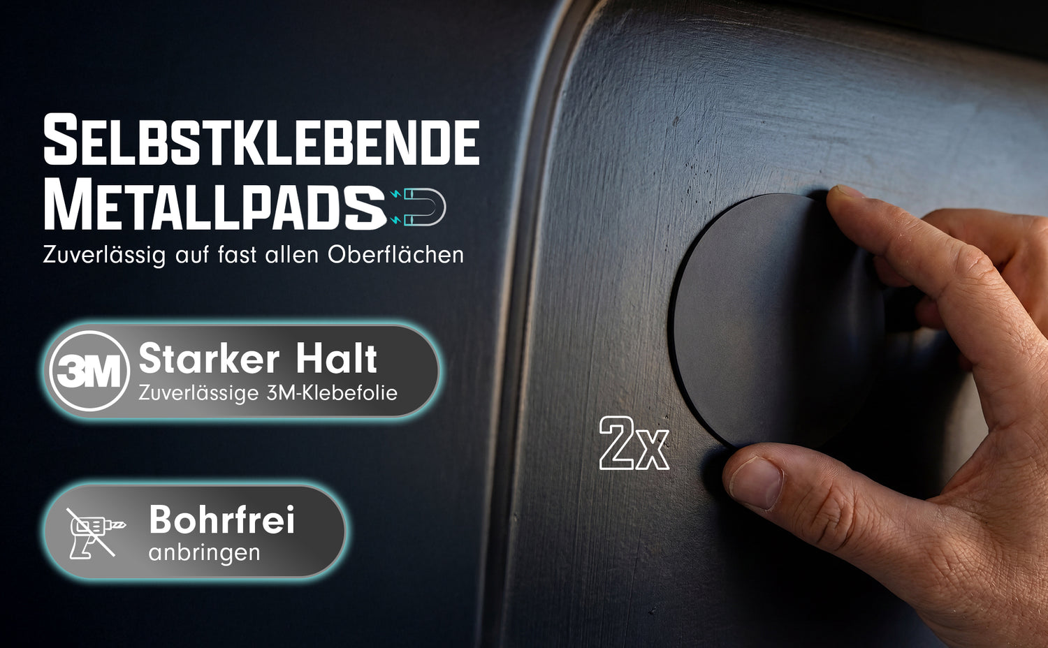 Die Pads sind aus hochwertigem, verzinktem Stahl gefertigt, nur 1,4 mm dünn und schmiegen sich dezent in dein Fahrzeugambiente ein – perfekt für die Anwendung im Innenraum oder auf lackierten Außenflächen.