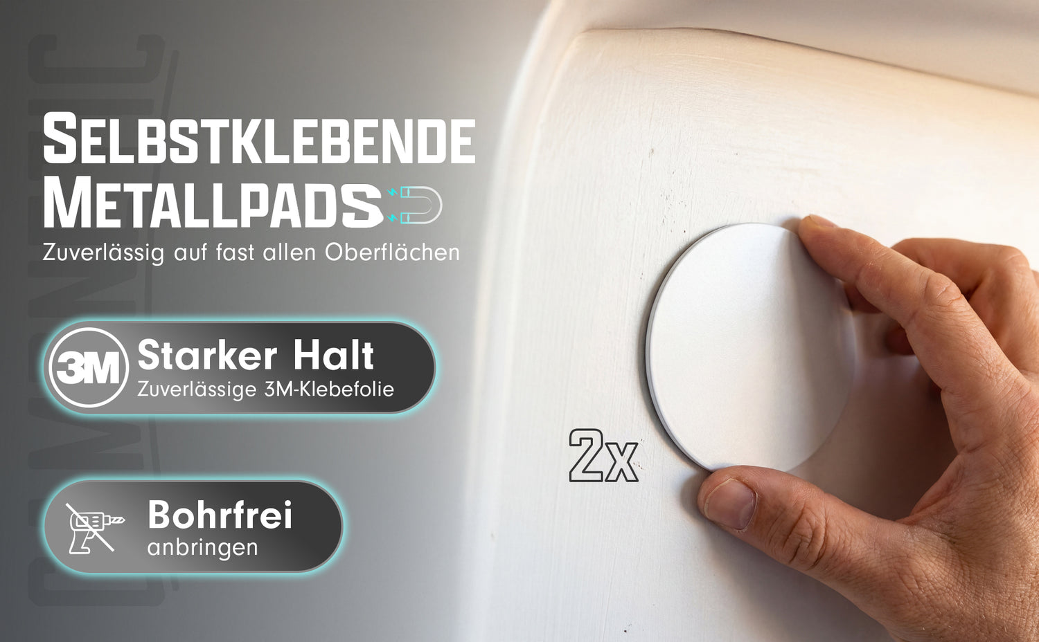 Mit unseren selbstklebenden Metallpads (auch bekannt als Haftpunkte oder Haftgründe) bringst du dein magnetisches Campnetic-Zubehör genau dort an, wo dein Camper kein Metall bietet – zum Beispiel an GFK-Aufbauten, Aluminiumflächen oder im ausgebauten Innenraum von deinem Camper.