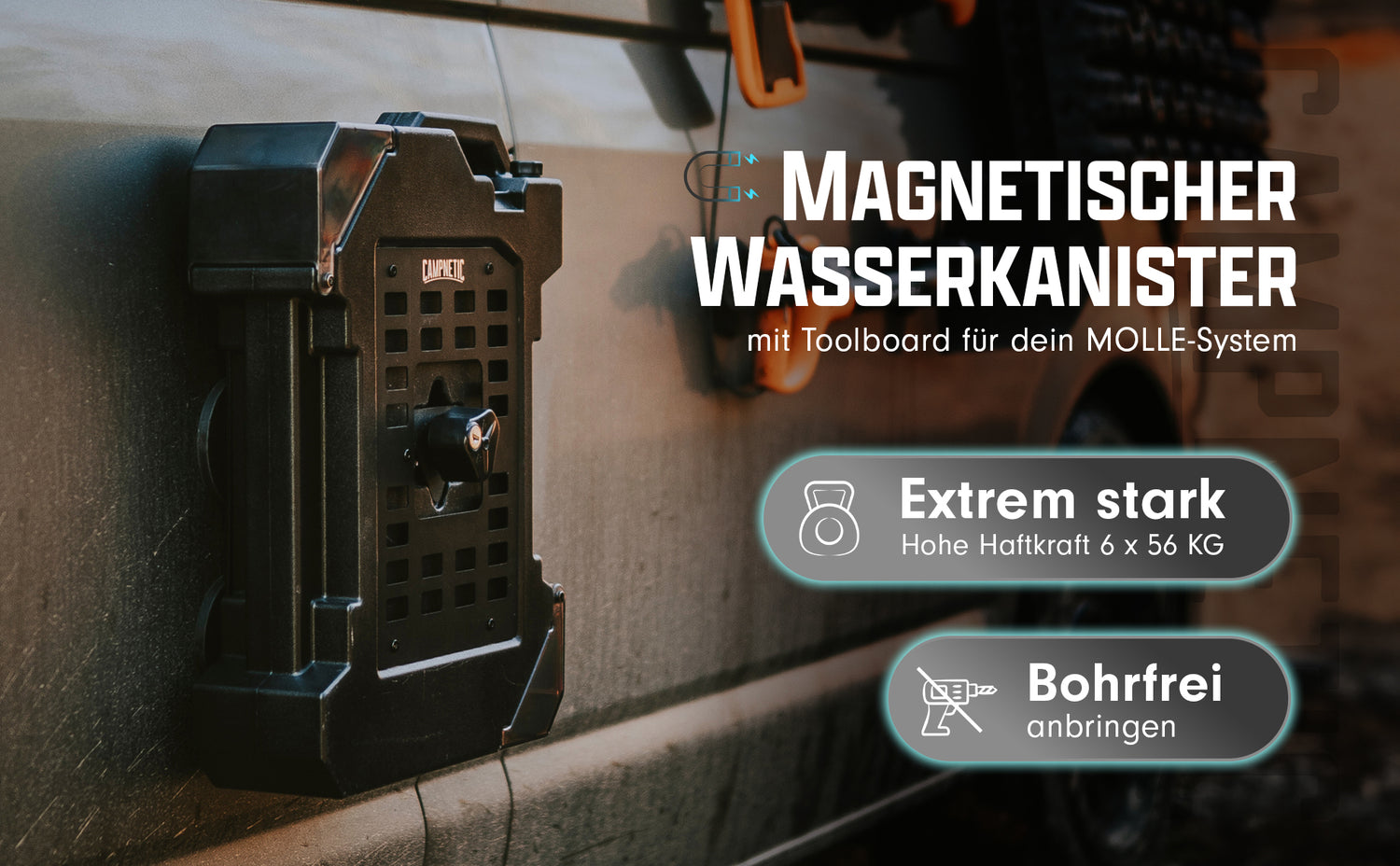 Der Campnetic magnetische Wasserkanister ist die perfekte Lösung für alle, die beim Camping, Vanlife oder im Kastenwagen flexibel, autark und organisiert unterwegs sein wollen. Mit seiner innovativen magnetischen Halterung befestigst du den 9-Liter-Trinkwasserkanister sicher außen am Fahrzeug – ganz ohne Bohren oder Schrauben.