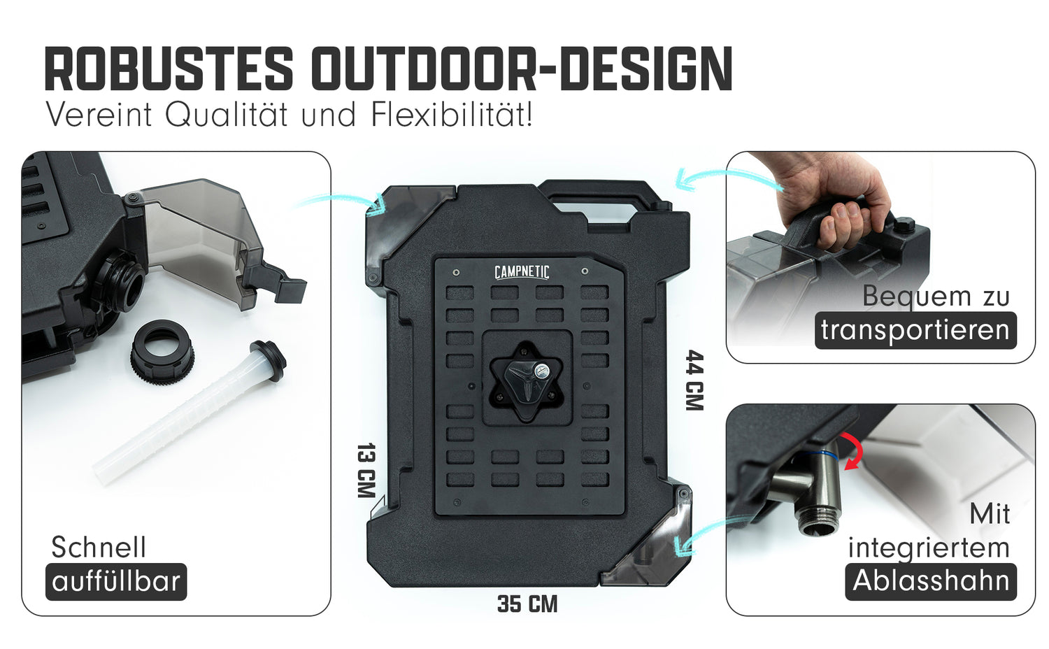 Der Campnetic magnetische Wasserkanister ist ein unverzichtbares Camping-Accessoire für alle, die unterwegs Wert auf Ordnung, Autarkie und maximale Flexibilität legen.