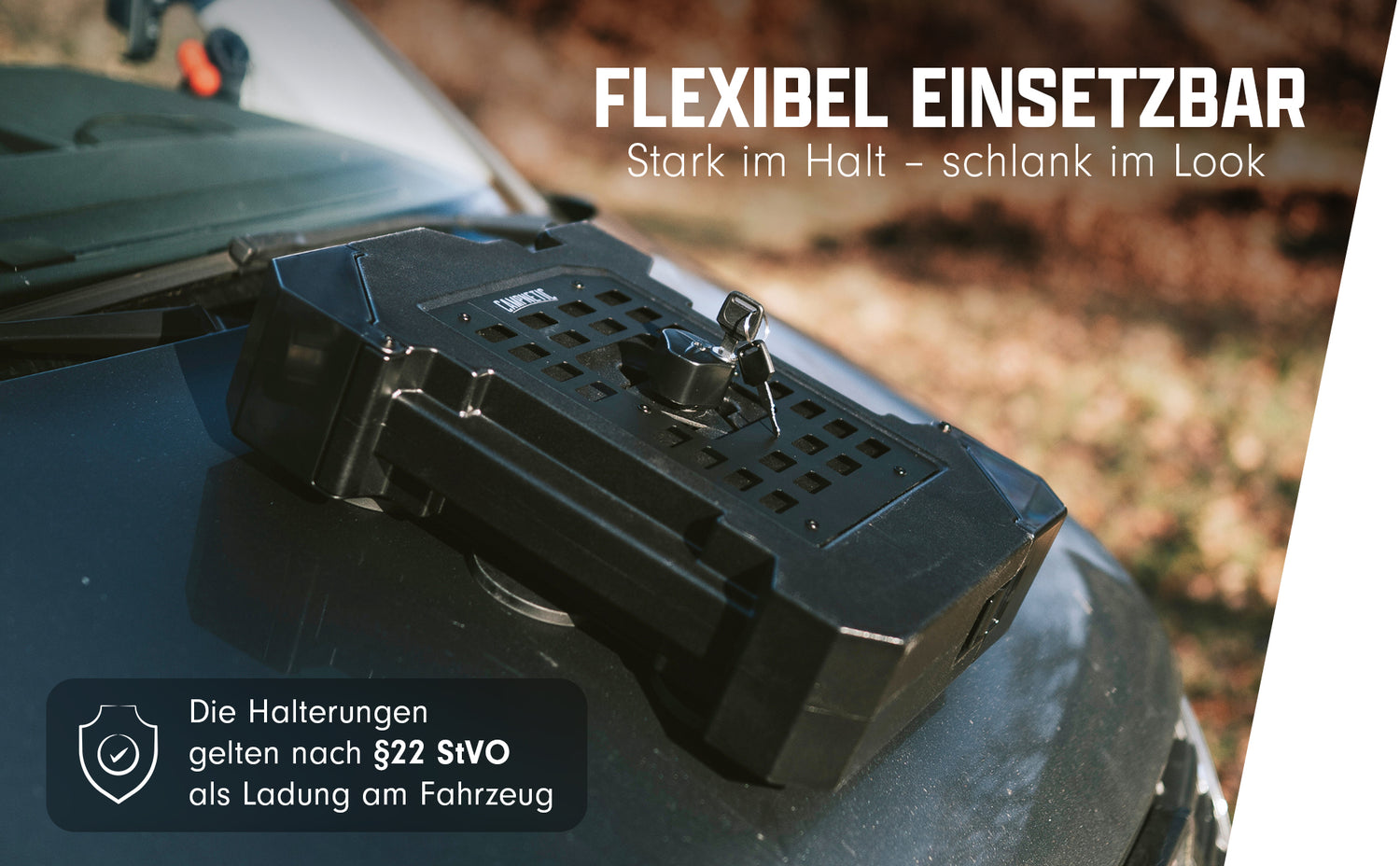 Dieses Produkt gilt nach §22 StVO als Ladung am Fahrzeug. Die sachgerechte Ladungssicherung und -Nutzung unterliegen der Verantwortung des Halters und Fahrers. Für unsachgemäßen Gebrauch wird keine Haftung übernommen.